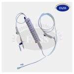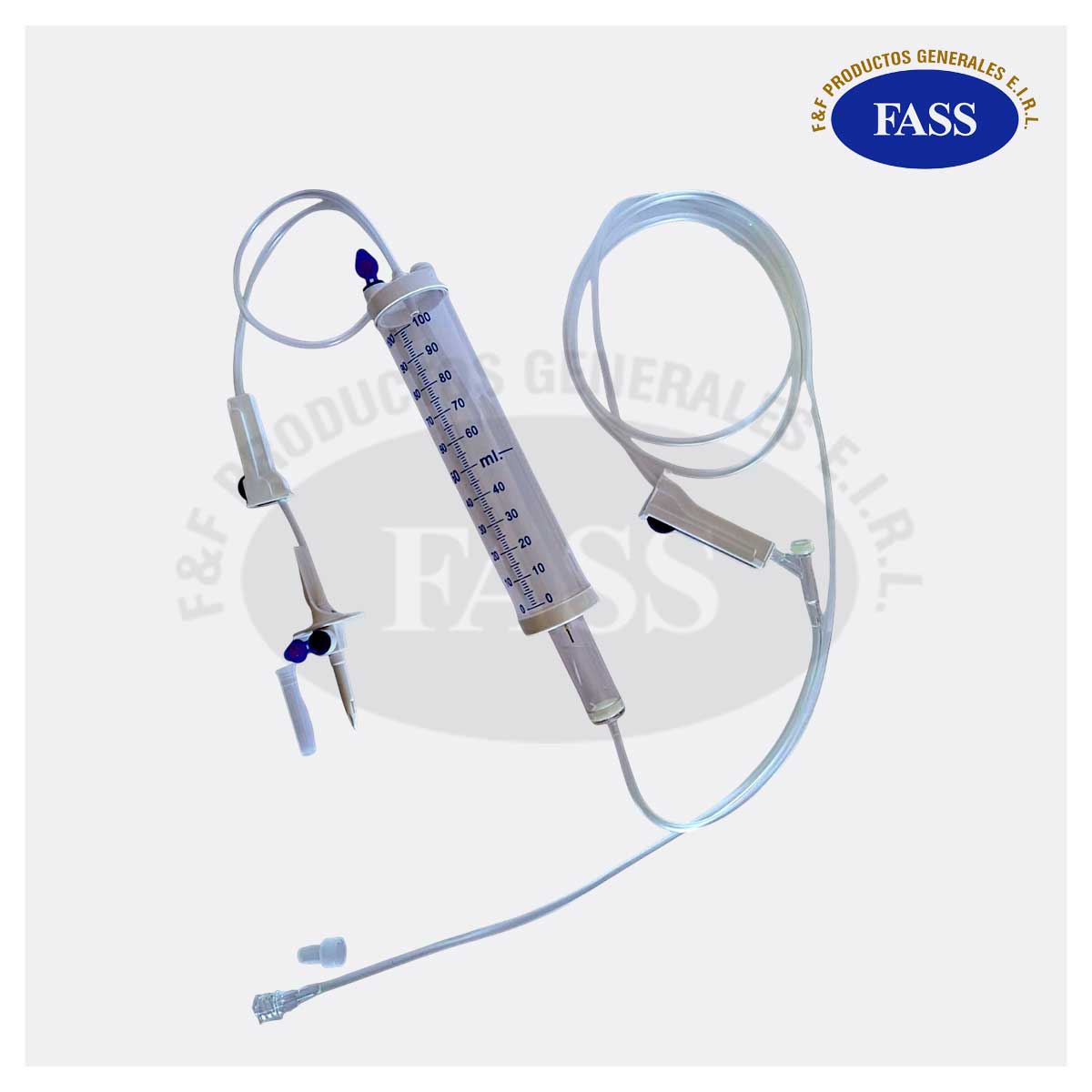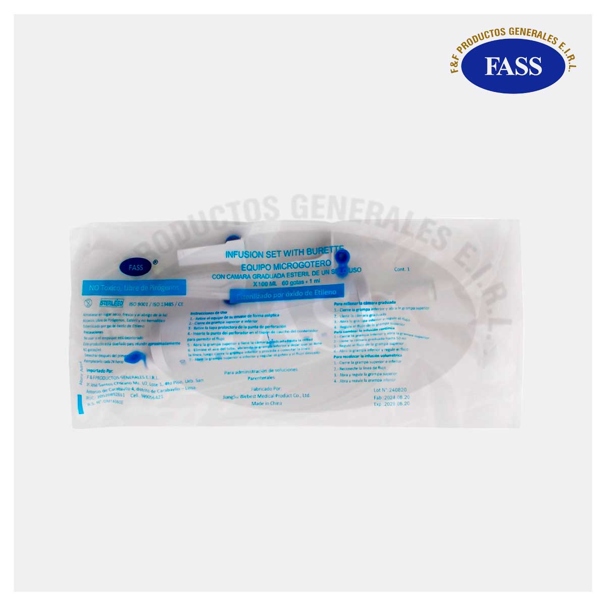 Dispositivo medico usado para la administración volumétrica de soluciones parenterales desde un contenedor intravenoso (IV) de líquido al sistema venoso del paciente, cuenta con dispositivo de punción, filtro de aire, bureta graduada de 100 mL, cámara de goteo de 60 gotas por minuto, regulador de flujo, sitio de inyección, conector cónico macho y protectores externos.